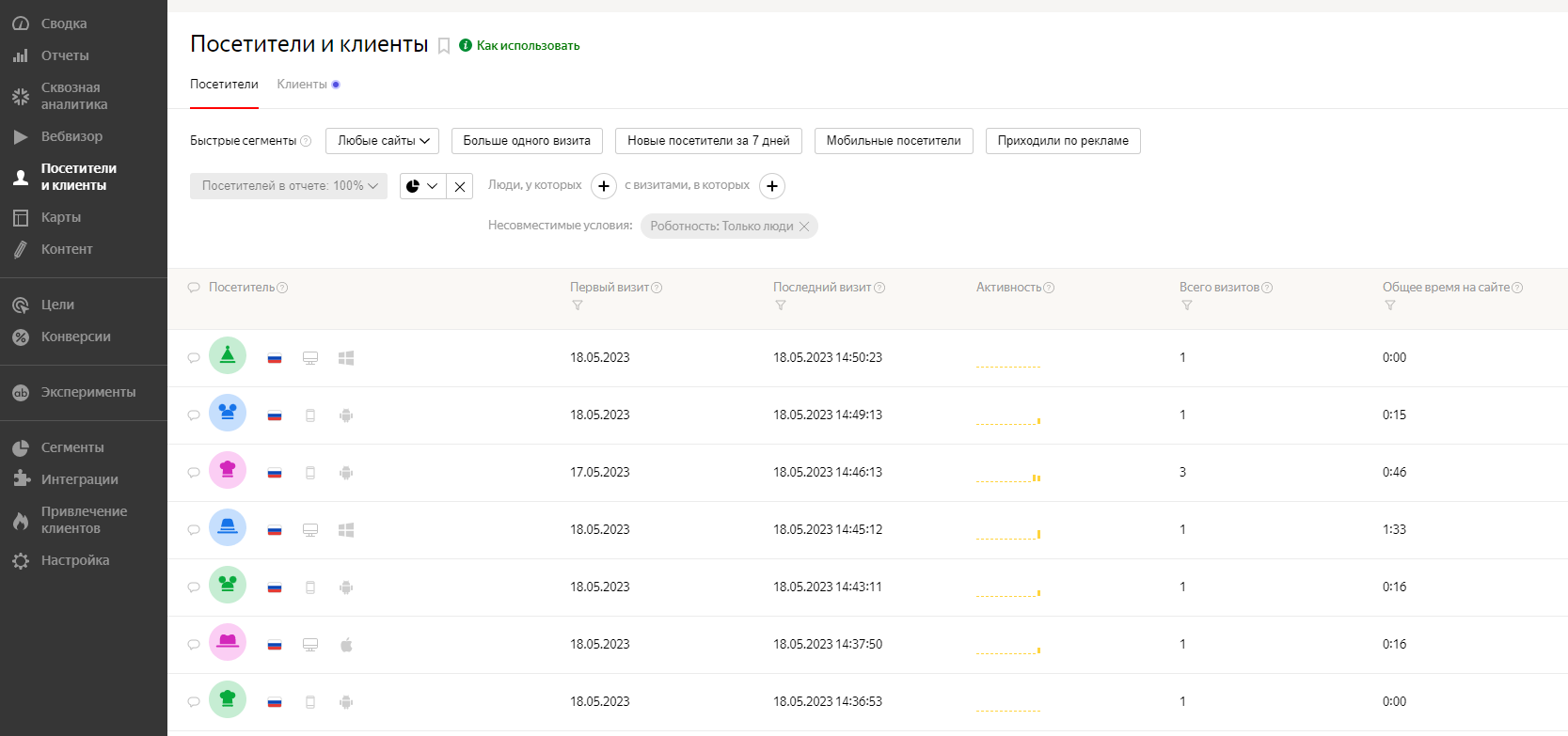 "Посетители и клиенты" - это отчет об активности посетителей. В нем перечислены все пользователи, которые когда-либо посещали сайт. В каждом из них есть информация о количестве посещений, покупок и потраченных деньгах. Можно просмотреть подробную информацию о каждом пользователе: даты всех посещений, посещенные страницы, источник переходов.