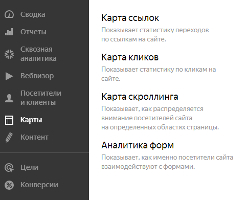 Карты показывают, на что чаще всего кликают пользователи. В этом разделе представлены четыре отчета:
