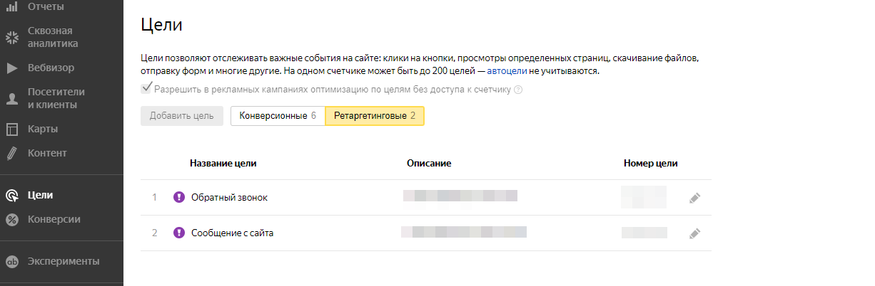 Вы можете добавить цели для просмотров страниц, посещений страниц, нажатий на контакты и других действий.