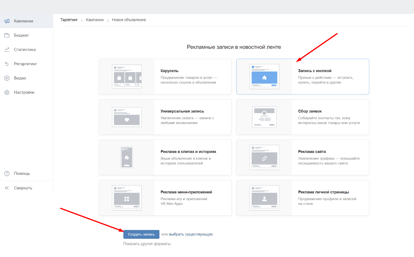 Выбор и настройка рекламного формата
