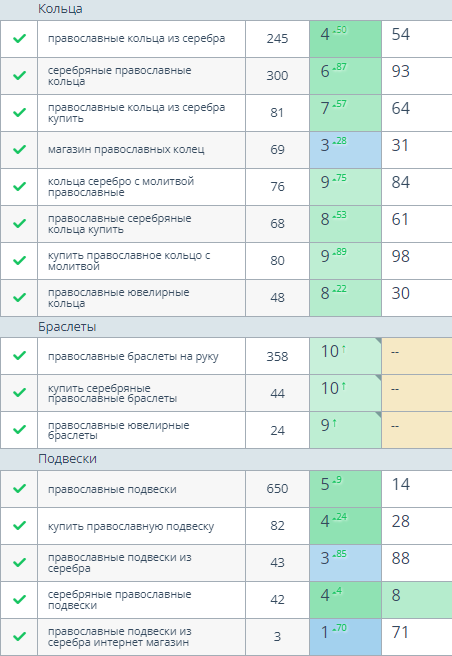 У нашего клиента были четкие пожелания по товарно-ассортиментным-группам, которые он хотел бы продвигать при помощи контекстной рекламы. Нашей задачей было охватить все товарно-ассортиментные направления ювелирных изделий клиента.