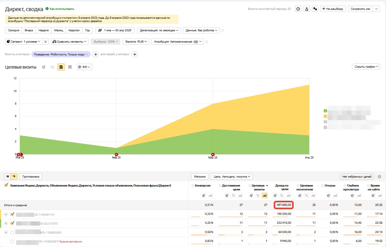 Были достигнуты хорошие показатели продаж с рекламы и бюджета в 10 000р., что подтверждает график Директ сводки за период с января по апрель 2025г. Видна доходность кампании и график продаж. Плюсом дополнительно большое обращение на сервис через звонки и чат на сайте.