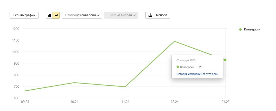 Как видно, по данным статистики, количество конверсий в декабре снижается по сравнению с показателем декабря, и тем не менее, мы получаем количество конверсий на 32% больше чем ноябре.