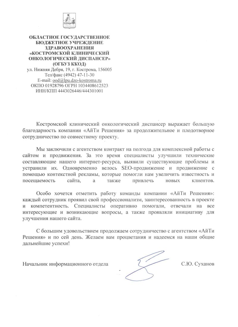 Костромской клинический онкологический диспансер выражает большую благодарность компании «АйТи Решения» за продолжительное и плодотворное сотрудничество по совместному проекту. Мы заключили с агентством контракт на полгода для комплексной работы с сайтом и продвижения. За это время специалисты улучшили технические составляющие нашего интернет-ресурса, выявили существующие проблемы и устранили их.