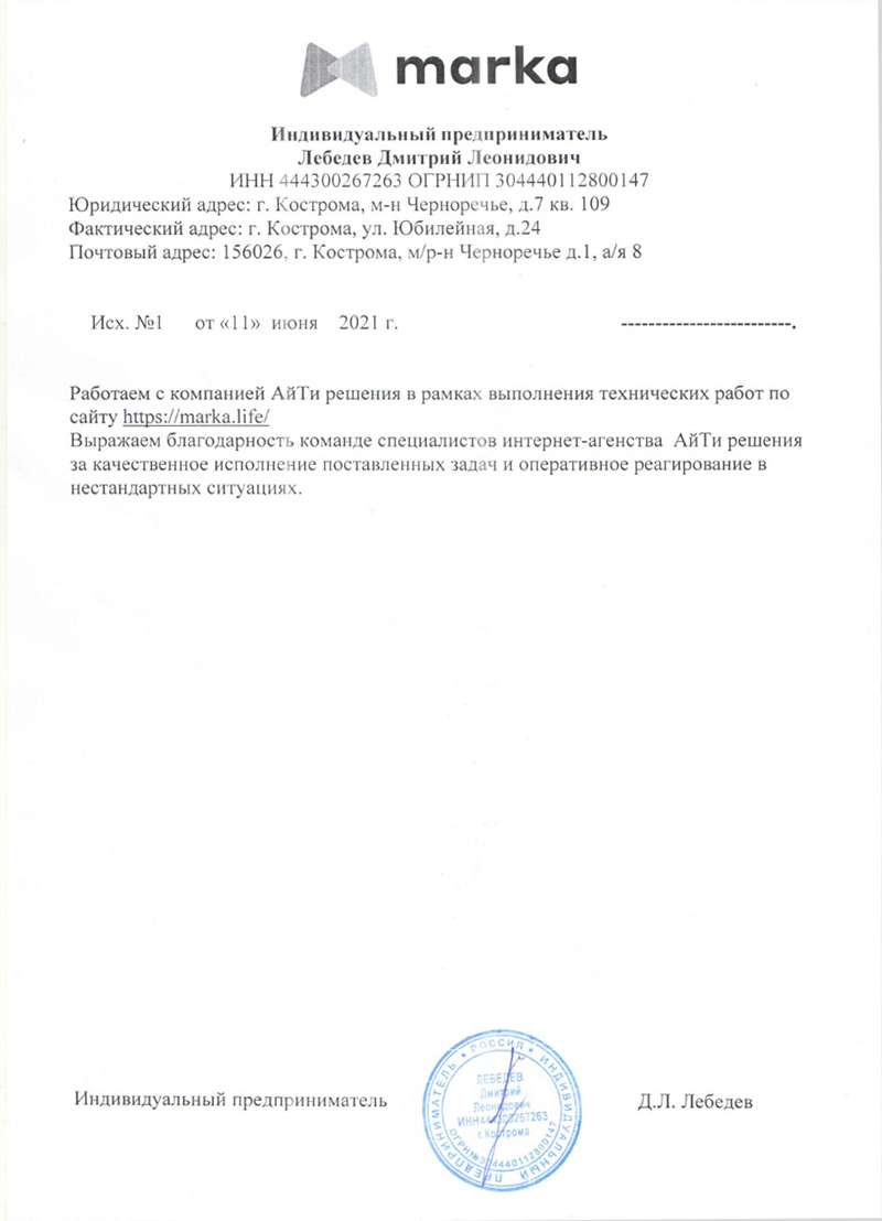 Работаем с фирмой АйТи решения в рамках выполнения технических задач по сайту marka.life. Выражаем благодарность команде специалистов агентства АйТи Решения за качественное исполнение поставленных задач и оперативное реагирование в нестандартных ситуациях.