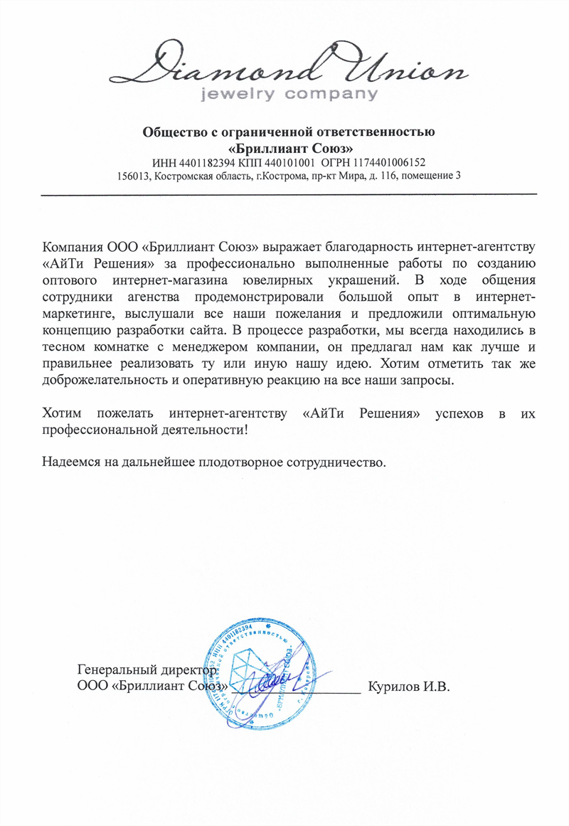 ООО "Бриллиант Союз" выражает благодарность агентству «АйТи Решения» за профессионально выполненные работы по созданию оптового магазина ювелирных украшений. В ходе общения сотрудники агентства продемонстрировали большой опыт в маркетинге, выслушали все наши пожелания и предложили оптимальную концепцию сайта. В процессе разработки, мы всегда находились в тесном контакте с менеджером компании, он предлагал нам как лучше и правильнее реализовать ту или иную нашу идею. Хотим отметить так же доброжелательность и оперативную реакцию на все наши запросы. Хотим пожелать агентству «АйТи Решения» успехов в их профессиональной деятельности! Надеемся на дальнейшее плодотворное сотрудничество.