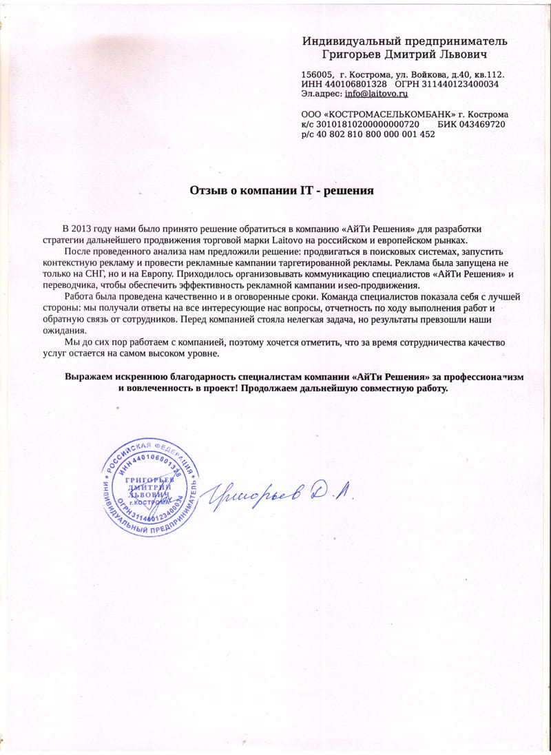 В 2013 году мы приняли решение обратиться в агенство "АйТи Решения" для проработки стратегии дальнейшего продвижения торговой марки Laitovo на российском и европейском рынках. После проведенного анализа нам предложили решение: продвигаться в поисковых системах, запустить контекстную рекламу и провести рекламные кампании таргетированной рекламы. Реклама запущена не только на СНГ, но и на Европу. Приходилось организовывать коммуникацию специалистов "АйТи Решения" и переводчика, чтобы обеспечить эффективность рекламной кампании и SEO-продвижения. Задачи выполнены качественно и в оговоренные сроки. Команда специалистов показала себя с лучшей стороны: мы получали ответы на все интересующие нас вопросы, отчетность по ходу выполнения работ и обратную связь от сотрудников. Перед компанией стояла нелегкая задача, но результаты превзошли наши ожидания. Мы до сих пор сотрудничаем, поэтому хочется отметить, что за время сотрудничества качество услуг остается на самом высоком уровне. Выражаем искреннюю благодарность специалистам за профессионализм и вовлеченность в проект! Продолжаем дальнейшее совместное сотрудничество.