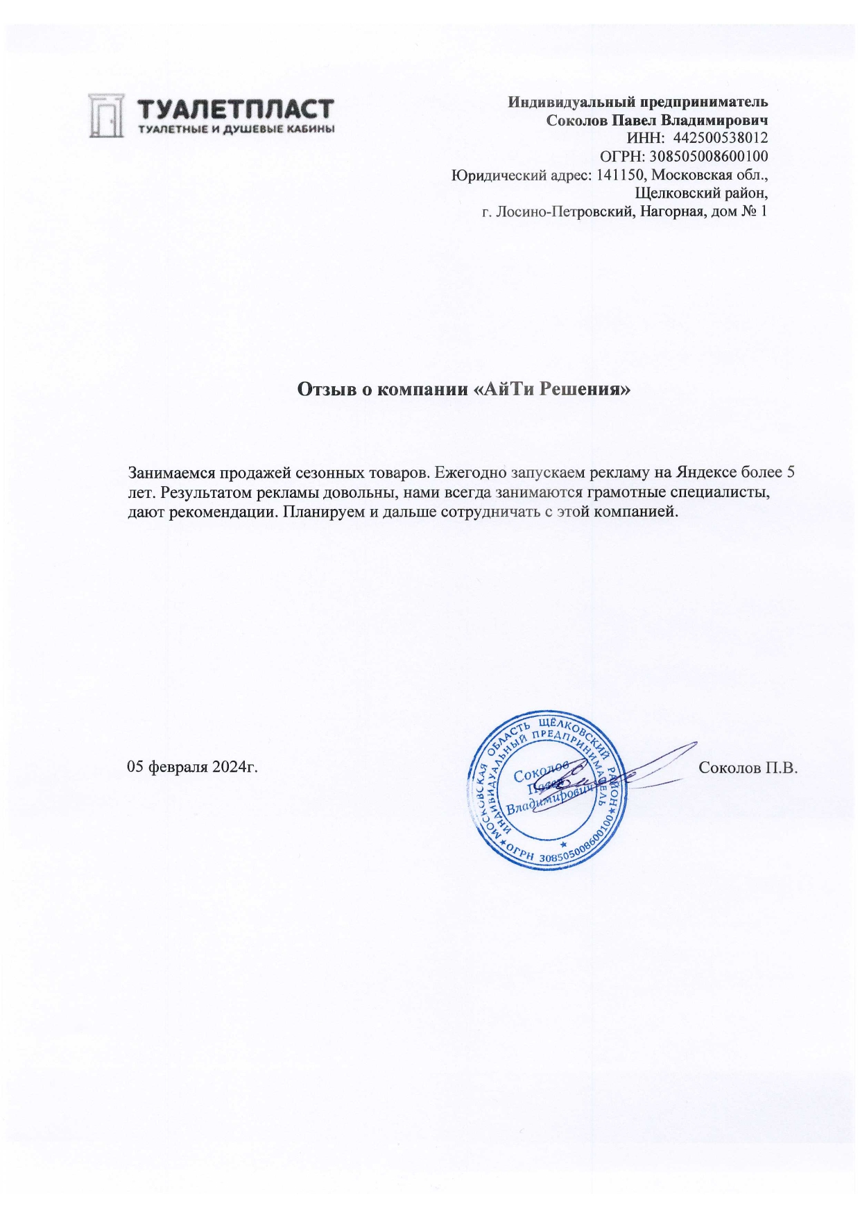 Занимаемся продажей сезонных товаров. Ежегодно запускаем рекламу на Яндексе более 5 лет. Результатом рекламы довольны, нами всегда занимаются грамотные специалисты, дают рекомендации. Планируем и дальше сотрудничать с этой компанией.