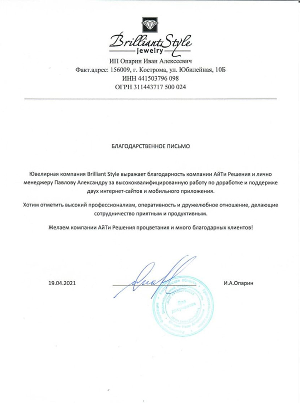 Выражаем благодарность компании "АйТи Решения" и лично менеджеру Павлову Александру за высококвалифицированную работу по доработке и поддержке двух сайтов и мобильного приложения. Хотим отметить высокий профессионализм, оперативность и дружелюбное отношение, делающие сотрудничество приятным и продуктивным.