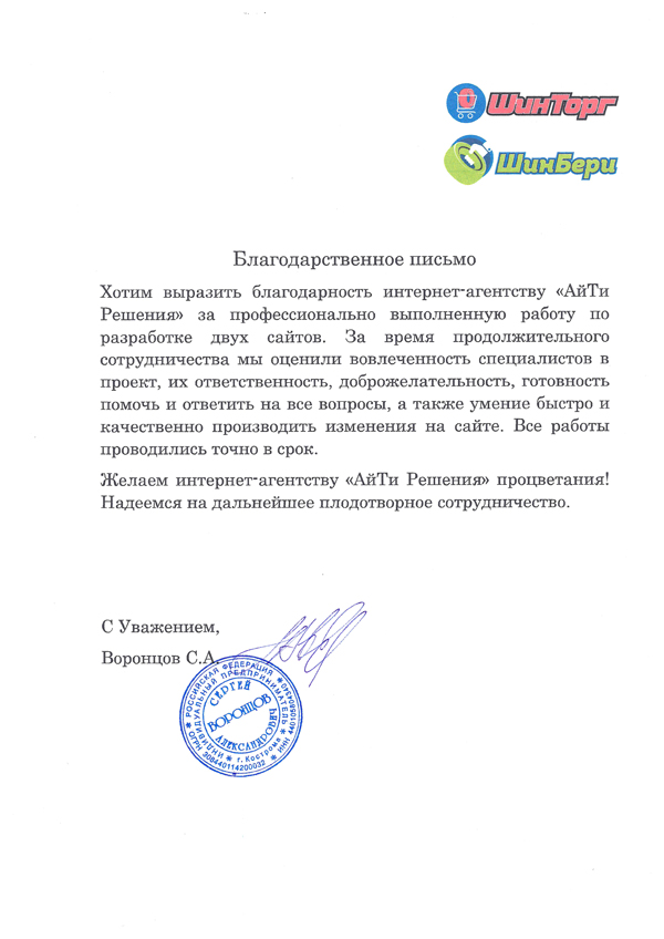Выражаем благодарность агентству "АйТи Решения" за проявленный высокий профессионализм в создании и постоянной модернизации проекта. Большой опыт в разработке сайта крупного масштаба, компетентность, быстро решение вопросов, возникающих в ходе работы, ответственность и доброжелательность персонала сделали сотрудничество приятным, плодотворным и эффективным. Желаем агентству "АйТи Решения" процветания и дальнейшего удержания лидерских позиций.