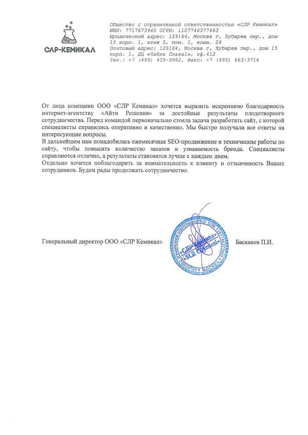От лица компании ООО "СЛР Кемикал" хочется выразить искреннюю благодарность интернет-агентству «АйТи Решения» за достойные результаты плодотворного сотрудничества. Перед командой первоначально стояла задача разработать сайт, с которой специалисты справились оперативно и качественно. Мы быстро получали все ответы на интересующие вопросы. В дальнейшем нам понадобилось ежемесячное SЕО-продвижение и технические правки по сайту, чтобы повысить количество заказов и узнаваемость бренда. Специалисты справляются отлично, а результаты становятся лучше с каждым днем. Отдельно хочется поблагодарить за внимательность к клиенту и отзывчивость Ваших сотрудников. Будем рады продолжать сотрудничество.