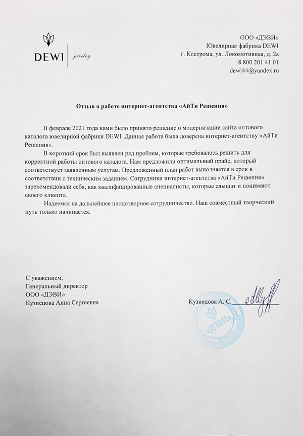 В феврале 2021 года мы приняли решение о модернизации сайта оптового каталога ювелирной фабрики "DEWI". Данная задача была доверена агентству "АйТи Решения". В короткий срок выявлен ряд проблем, которые требовалось решить для корректной работы оптового каталога. Нам предложили оптимальный прайс, который соответствует заявленным услугам. Предложенный план выполняется в срок в соответствии с техническим заданием. Сотрудники "АйТи Решений" зарекомендовали себя как квалифицированные специалисты, которые слышат и понимают своего клиента.