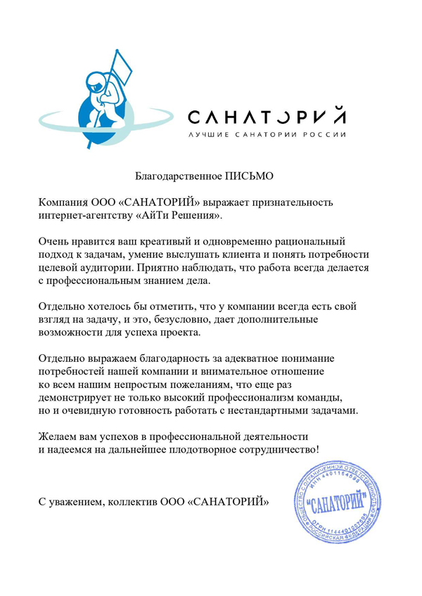 Выражаем искреннюю благодарность агентству «АйТи Решения» за продуктивную работу в рамках создания сайта для нашей компании. Ваш коллектив показал профессионализм и компетентность. Хотим отметить ответственность и отзывчивость специалистов, а также качественное и быстрое выполнение задач. Сотрудничество считаем очень плодотворным и эффективным. Сайт выглядит современно и полностью соответствует техническому заданию, которое было Вам поставлено.
